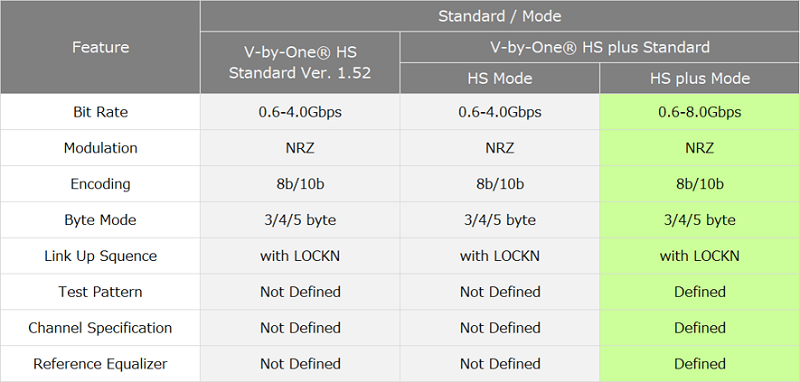 從2023年6月1日起,我們開始提供license。盡管原來的V-by-One HS仍可繼續(xù)使用,但V-by-One HS規(guī)格的新license將停止發(fā)行,并將統(tǒng)一到 V-by-One HS plus規(guī)格中。在V-by-One HS plus規(guī)格中,有與V-by-One HS最終版本Ver.1.52完全兼容的「HS模式」以及新添加的「HS plus模式」的兩個(gè)定義,用戶可選擇其中一種或兩種模式進(jìn)行實(shí)裝(圖2)。