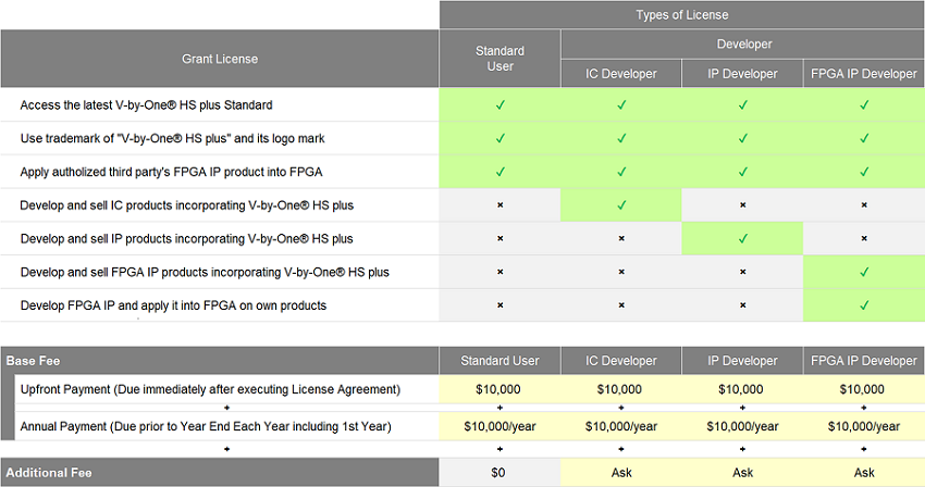 接下來說明一下V-by-One HS plus 標(biāo)準(zhǔn)的license費(fèi)用。 在這次的新規(guī)格中,每種license類型的定義如圖 6 所示。 對(duì)設(shè)計(jì) LSI 和 IP核 的用戶(LSI制造商和 IP核供應(yīng)商)以及使用IP核設(shè)計(jì) FPGA 的用戶提供付費(fèi)授權(quán)。