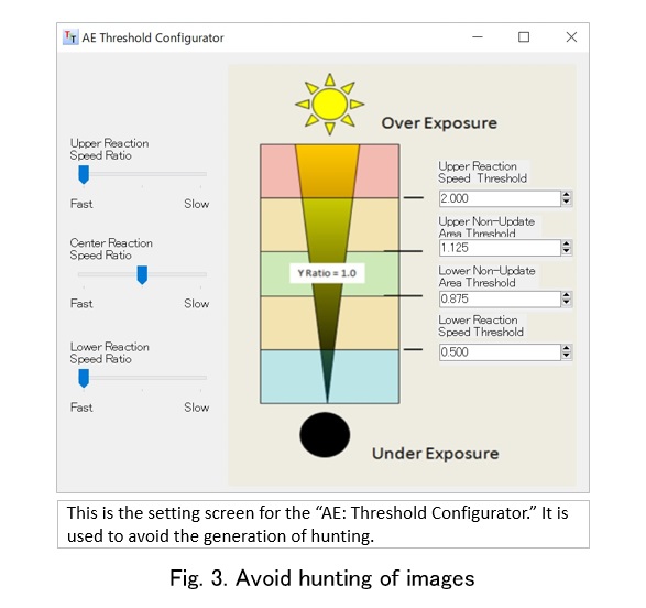 第4個(gè)就是「AE: Diagram Configurator」。這是對(duì)被攝體的明亮度通過方框圖(圖表)來設(shè)定增益與快門速度(實(shí)際指倒數(shù)的曝光時(shí)間)的一種配置程序。增益與曝光時(shí)間是互相調(diào)整的關(guān)系。曝光時(shí)間越短就越不容易受抖動(dòng)影響,但需要將增益提高所以噪點(diǎn)就會(huì)變大。但如果為了降低噪點(diǎn)而將曝光時(shí)間延長(zhǎng),則對(duì)抖動(dòng)的耐力就會(huì)變?nèi)?。因此,根?jù)用途不同,很難單選1個(gè)圖表。而這個(gè)配置程序可同時(shí)記錄3種模式。即降噪并畫質(zhì)優(yōu)先的模式以及拍攝高速運(yùn)動(dòng)中的被攝體的防抖動(dòng)模式等。