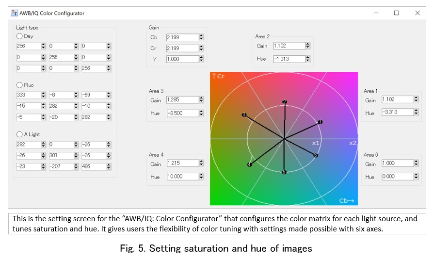 第7個(gè)是「AWB/IQ: Color Configurator」。這是與色彩相關(guān)的配置程序??稍O(shè)定3種光源各自的色彩矩陣、鮮艷度和對(duì)每個(gè)色調(diào)進(jìn)行微調(diào)(圖5)。