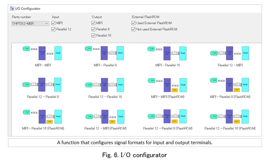 SP芯片中輸入I/F分為2種:MIPI CSI-2信號(hào)和并聯(lián)信號(hào)。而輸出I/F分為3種:MIPI CSI-2信號(hào)、8bit的并聯(lián)信號(hào)和16bit的并聯(lián)信號(hào)。因此需要根據(jù)前段和后段的裝置來設(shè)定與所選信號(hào)形式相符的輸入/輸出端機(jī)能。使用這次準(zhǔn)備的I/O配置程序就能在PC上簡(jiǎn)單地進(jìn)行設(shè)定。