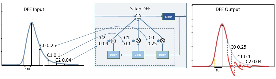 另外, CTLE與DFE的作用分擔(dān)上來說,針對EYI完全閉合后的收信波形,首先使用CTLE處理后使EYE打開到一定程度;之后再使用DFE進(jìn)一步降低振動,使EYE開口更為擴(kuò)大。